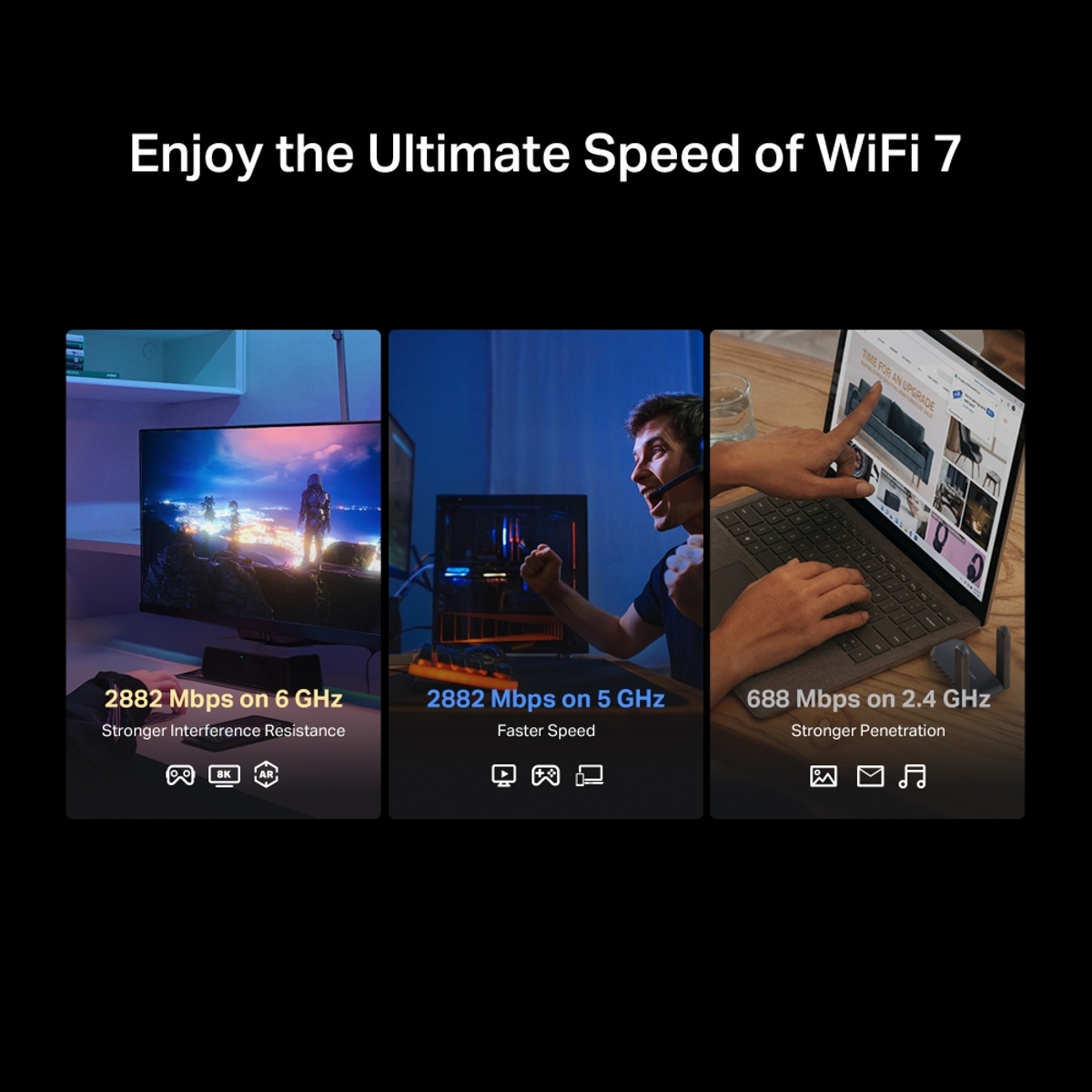 - Трибандова Wi-Fi скорост – Скорости до 2882 Mbps (6 GHz) + до 2882 Mbps (5 GHz) и до 668 Mbps (2.4 GHz).